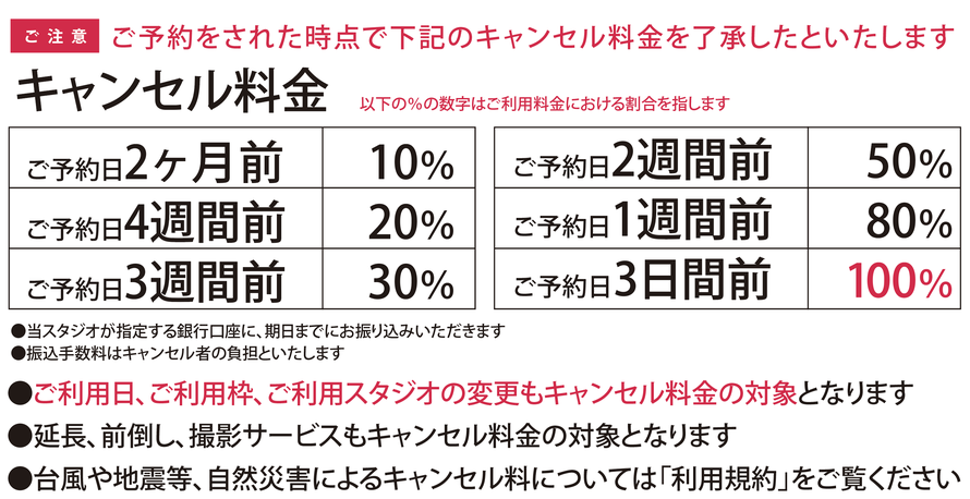 キャンセル希望の方は予約日時、枠、スタジオ名、予約時のフルネーム、